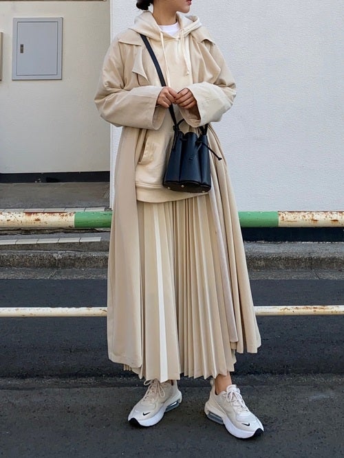 きれいめプリーツスカートにあえてオーバーサイズのパーカーを合わせて抜け感のある着こなしに。