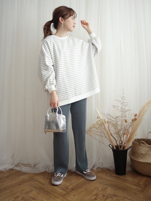 定番のボーダートップスも、淡いライトグレーカラーを選ぶと春らしさがアップします。
