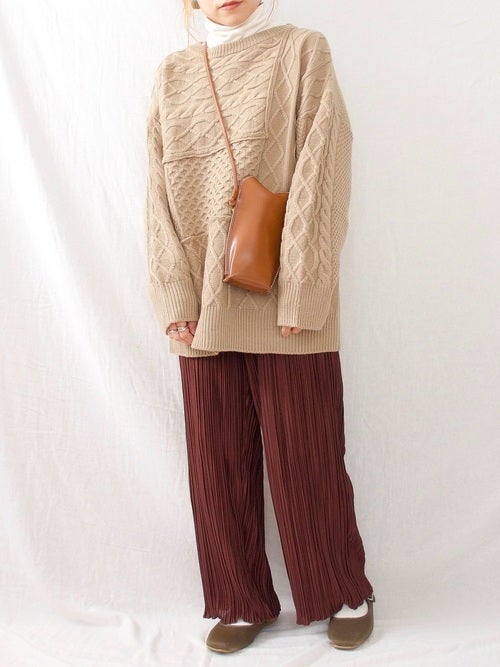 カラーバリエーションが豊富なのも魅力です。ベージュのトップスを合わせて濃淡を効かせましょう。