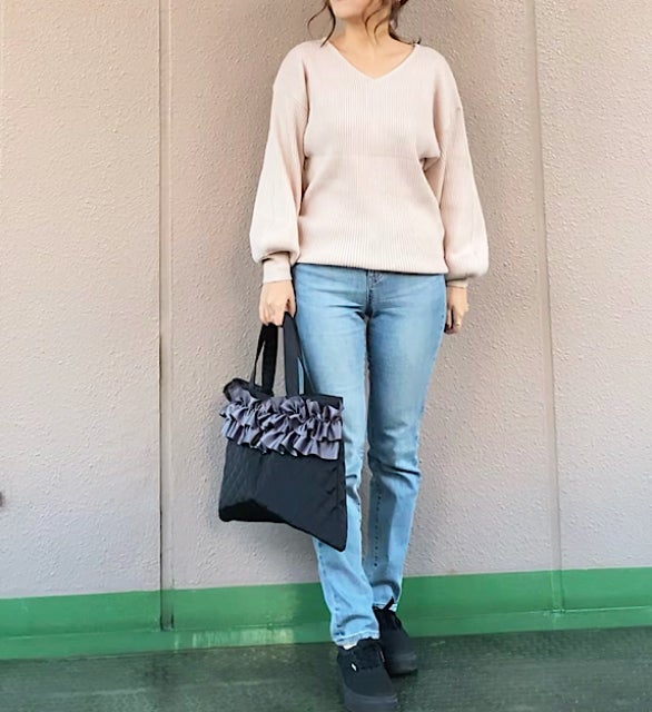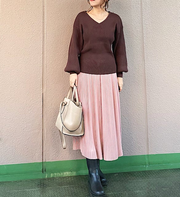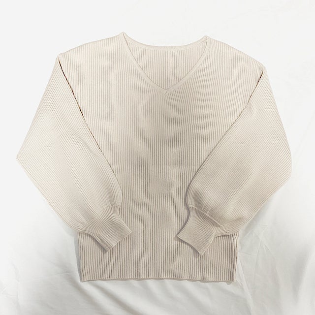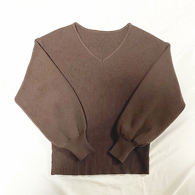 シンプルなフォルムのVネックニット。お袖のポワン感もとっても可愛いです。