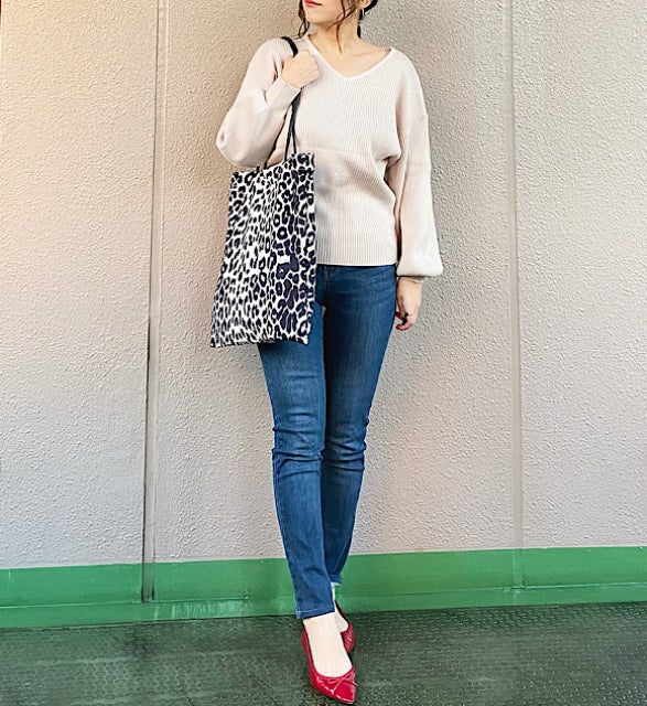 トップス、ボトムスともに単色なので、レオパードのバッグをアクセントで加えることで、オシャレ感も高まります。