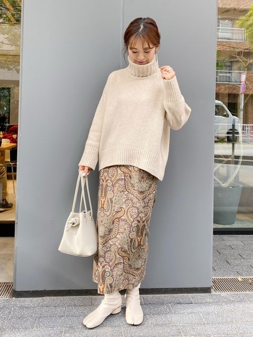 ボトムスは、淡いトーンが2021年秋らしいペイズリー柄のタイトスカートをセレクトして、都会的なムード漂う骨格ナチュラルのソフトエレガントさん向けコーディネートを完成させましょう。
