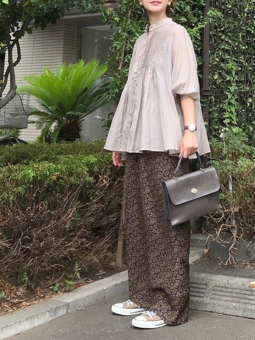 ボリューム袖ブラウス×柄ワイドパンツコーデ