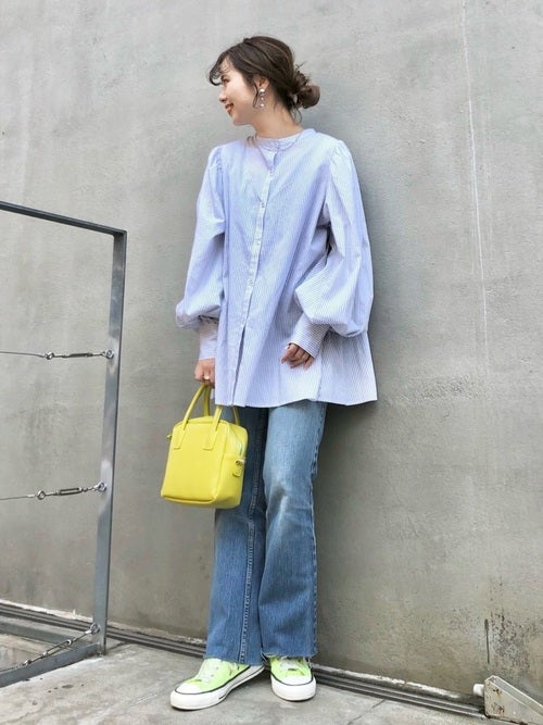 ボトムスはデニムパンツでカジュアルにまとめたら、イエローのバッグとスニーカーで、パーソナルカラーサマーさん向けのコーディネートに春らしい差し色を加えましょう。