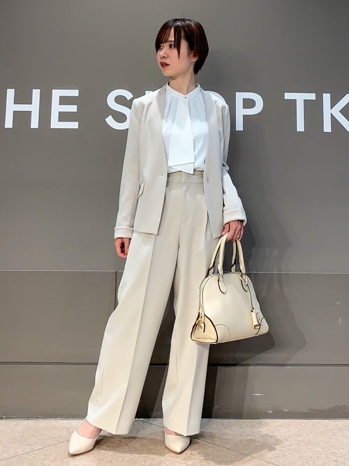 インナーは、ソフトエレガントさんの雰囲気にマッチする白のボウタイブラウスが◎。