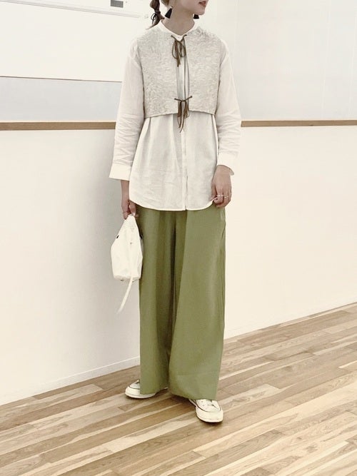 ゴブラン織りビスチェ×緑ワイドパンツコーデ
