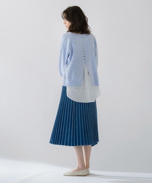 今シーズン、パーソナルカラーサマーの骨格ナチュラル・ソフトエレガントさんへの一推しは、ライトブルーのスリット入りニットに、シャツをレイヤードしたように見えるドッキングトップス。