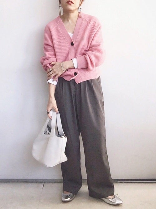 ベーシックなネックカーディガンをトップスにセレクトするなら、パーソナルカラースプリングの骨格ナチュラル・ソフトエレガントさんに似合うストロベリーピンクのアイテムで、女性らしい柔らかさを出すのがおすすめですよ。