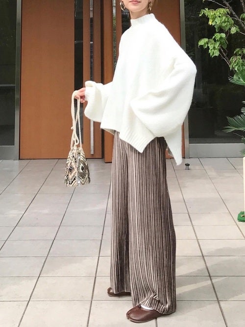 黄色味が控えめなココアブラウンのプリーツワイドパンツなら、パーソナルカラーサマーやウィンターの人でも挑戦しやすいはずですよ。