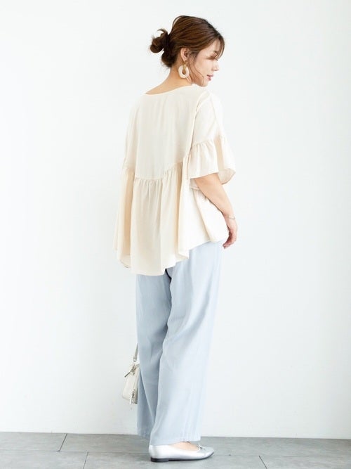 ゆったりと絞りのないシルエットの白フリルトップス+水色ワイドパンツのファッションで、パーソナルカラーサマーの骨格ナチュラル・ソフトエレガントさんならではの、ほんのりスイートなコーデを楽しんでみてはいかがでしょうか。