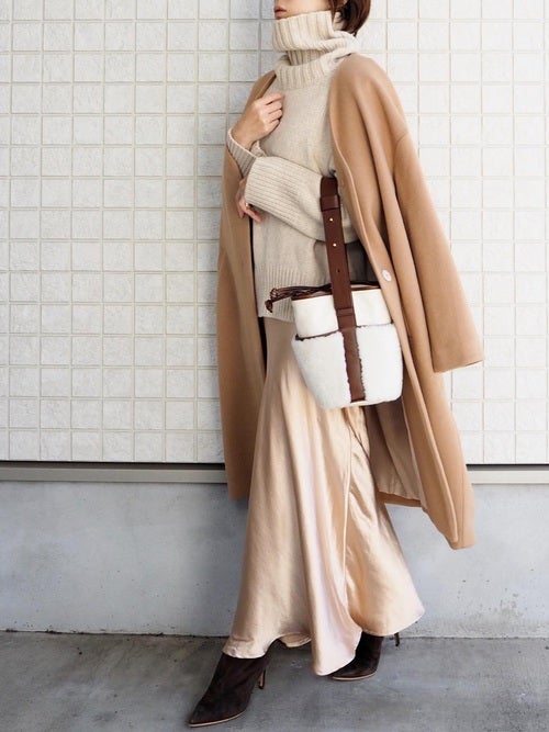 アウターや小物類はまろやかなベージュで統一すれば、デリケートなニュアンスがおしゃれな骨格ナチュラルのソフトエレガントさんならではの冬コーディネートに。
