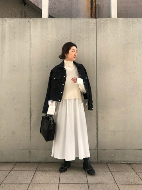トップスは、顔映り◎な白のハイネックニットで、クリアな印象のソフトエレガントの骨格ナチュラルさんコーデにまとめて。