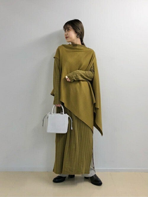 とはいえ、直線的過ぎる着こなしは、顔タイプ・ソフトエレガントの骨格ナチュラルさんには似合いにくいので、ベージュのアシンメトリーニット+カーキイージーパンツの組み合わせで、ほんのりとセンシュアルなパーソナルカラーオータムのソフトエレガント・骨格ナチュラルらしいコーディネートにまとめましょう。