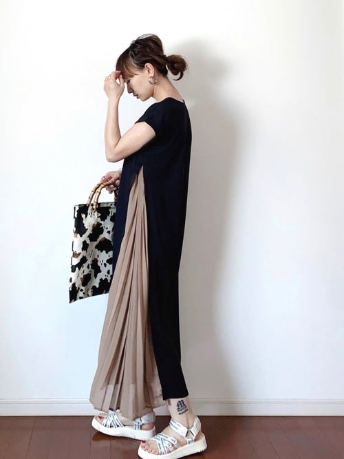 最後に、ハードにならないウシ柄のバッグをコーデのポイントにプラスして完成です。