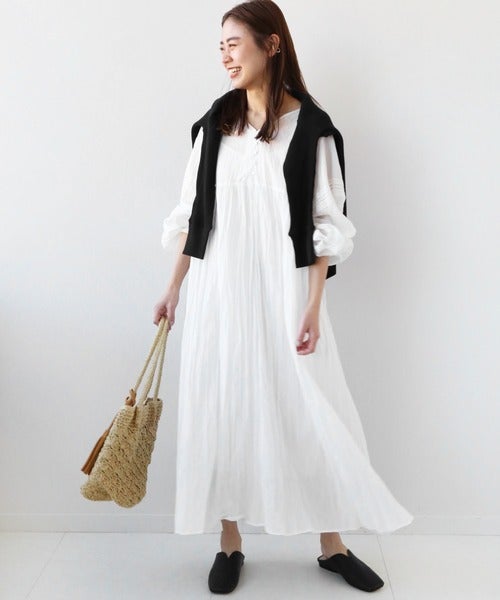 白のコットンワンピースはベーシックに使えて着回し力も抜群です。シワ加工の柔らかな生地がナチュラルな表情を演出してくれます。