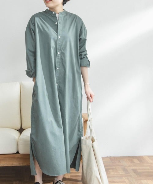 定番のバンドカラーシャツワンピースは、きれいめグリーンをチョイスしてより爽やかな春ファッションを楽しんで。