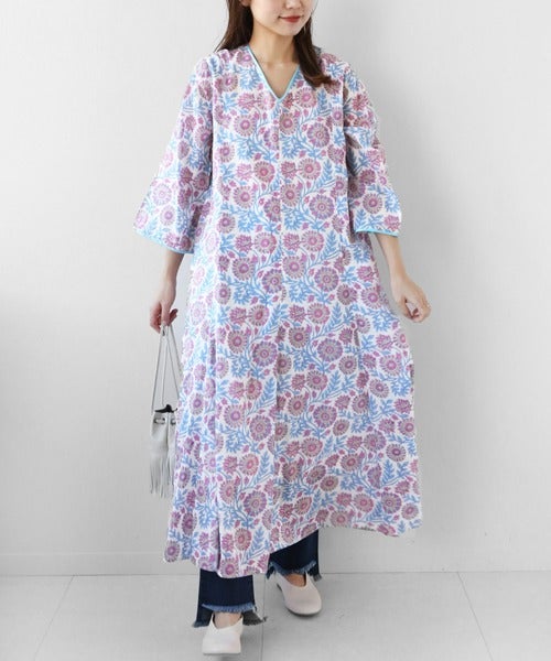 肌触りの良いインド綿で仕立てた、オリエンタル柄ワンピースはリラックス感のある着こなしが叶う1枚。