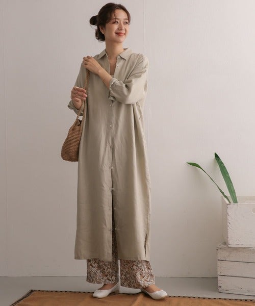 絵画のようなロマンティックなフラワープリントが目を引くロングワンピース。シャツタイプのきれいめな印象が大人女子のコーデに重宝しますよ。