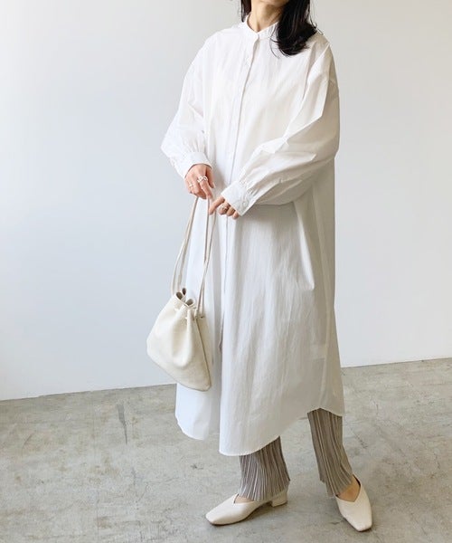 ベーシックなデザインでアレンジコーデが楽しめる白のバンドカラーシャツワンピース。