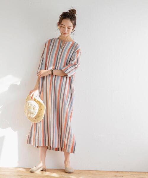 マルチストライプの華やかなカラーリングが目を引くクルタワンピースは、春のお出かけコーデに大活躍。