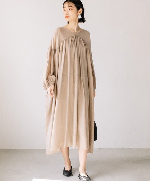 ボリューム袖と全体にふんわりとしたシルエットが大人可愛いインド綿ギャザーロングワンピース。
