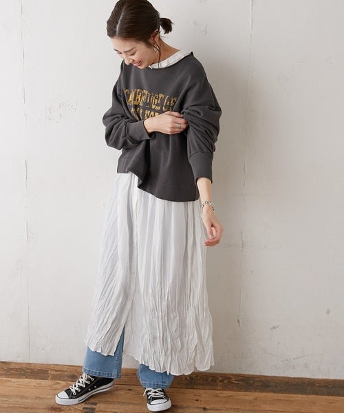 古着ライクなスウェットを重ねて、ラフな着こなしを楽しむのもおすすめです。