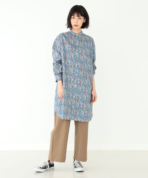 鮮やかなブルーが際立つリバティ柄のスタンドカラーワンピースは、パンツやレギンスを重ねたレイヤードコーデがおすすめ。