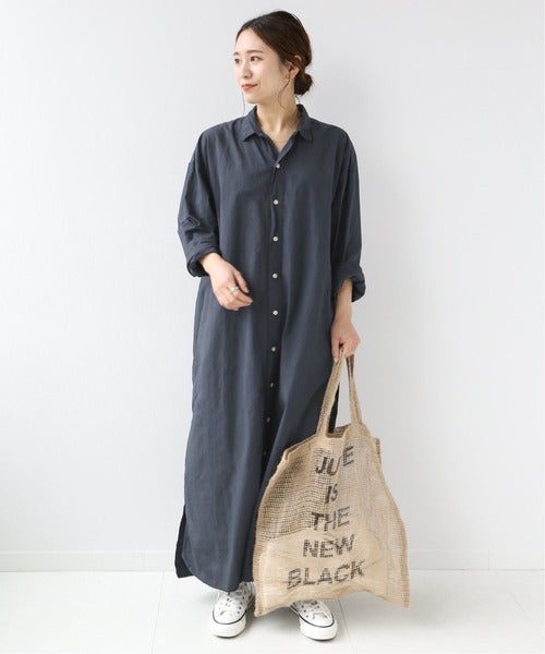 組み合わせ次第できれいめにもカジュアルにも着こなせる、ネイビーカラーのマキシ丈シャツワンピース。