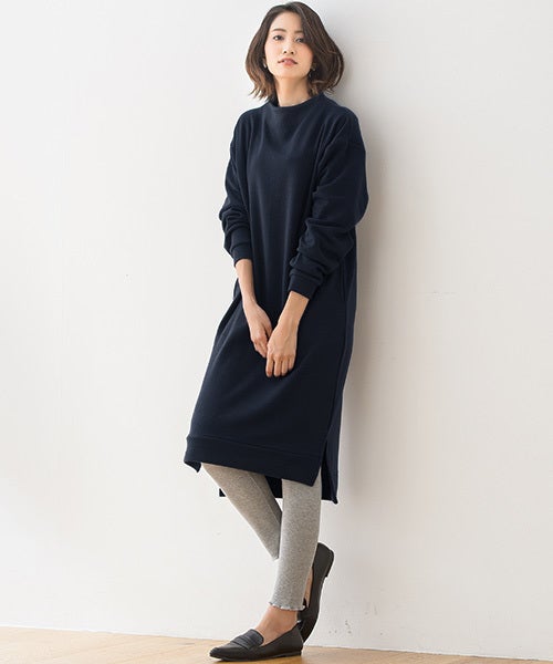 アウターを羽織ってもかさばらないスウェットワンピースは、ロングシーズンに渡って重宝しそうですね。
