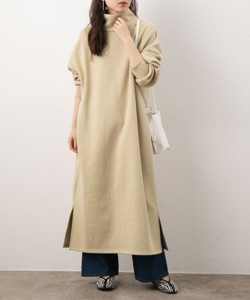 トレンド最先端の着こなしを楽しめるのが、タートルネックのスウェットワンピースです。