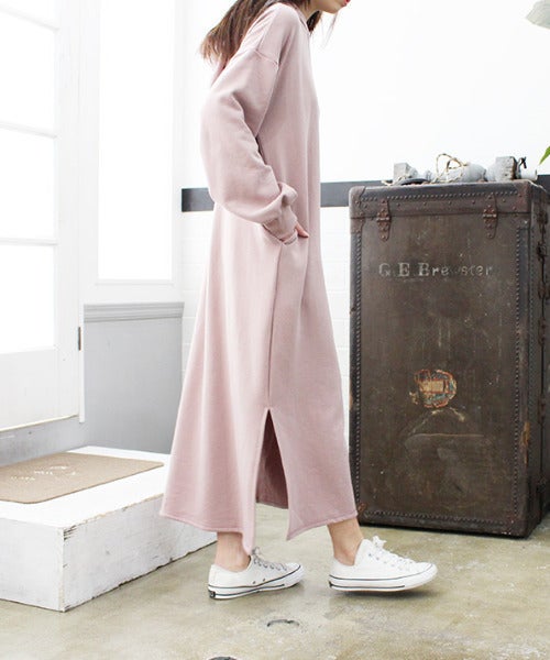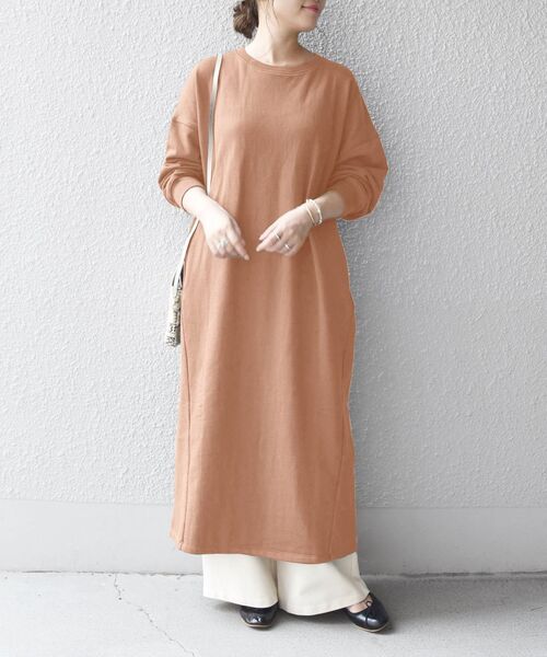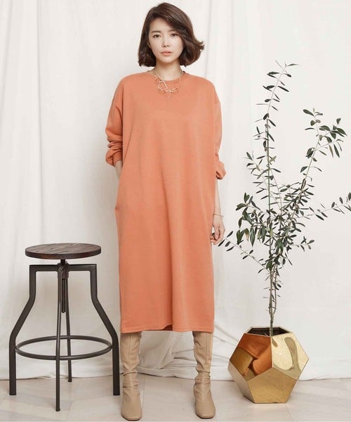 ややオレンジがかったピンクのスウェットワンピースは、肌馴染みが良くナチュラルに着られます。