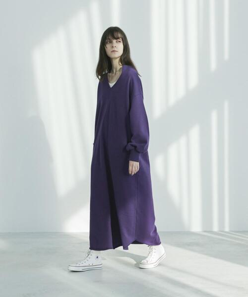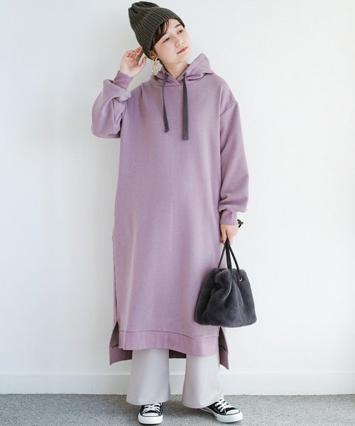 なかなか見ないパープルのスウェットワンピースは、アウターなしの時期でも十分サマになります♡