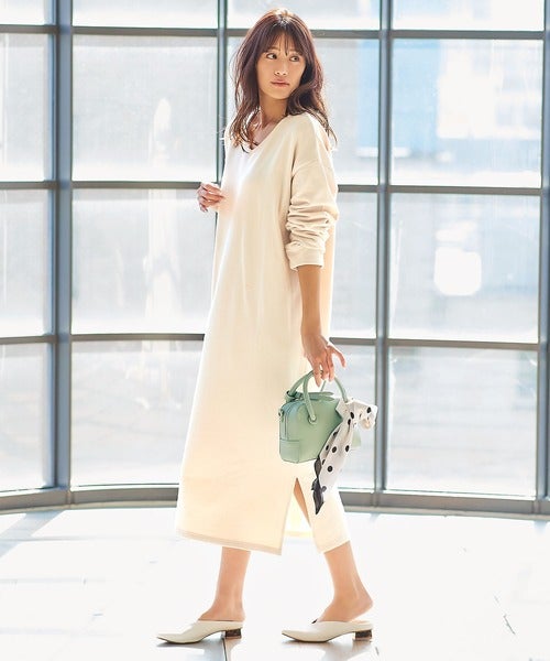 春のきれいめコーデには、Vネックのスウェットワンピースがおすすめです。