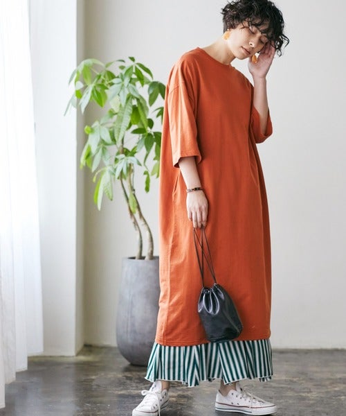 春らしいオレンジのスウェットワンピースは、ビッグTシャツをそのままワンピースにしたような1枚でこなれ感たっぷりに。