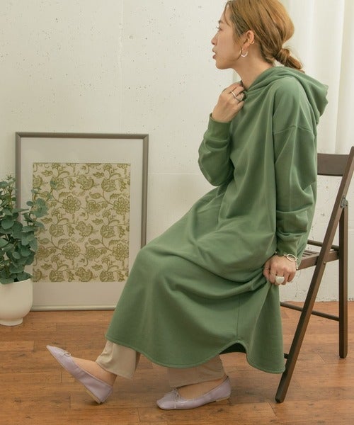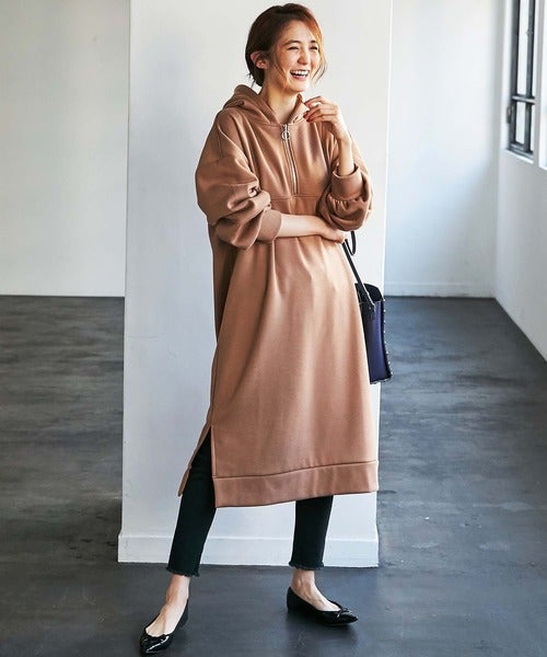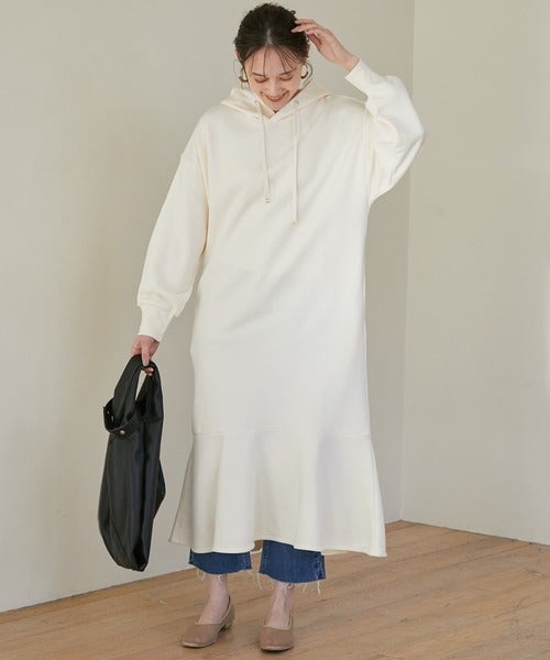 フード付きならアウターとのバランスも良く、スウェットワンピースならではのリラックス感を演出してくれますよ。