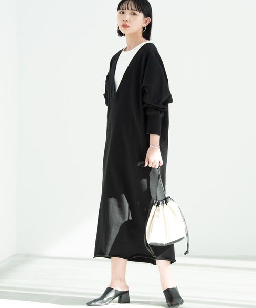 部屋着感の出やすいスウェットワンピースですが、胸元の深い開きが程良いアクセントに。
