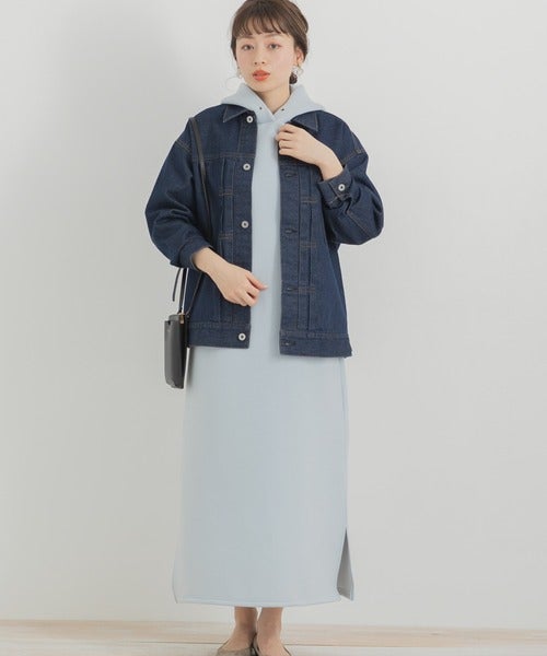 春アウターの代表格であるデニムジャケットには、柔らかなブルーのスウェットワンピースがお似合い。
