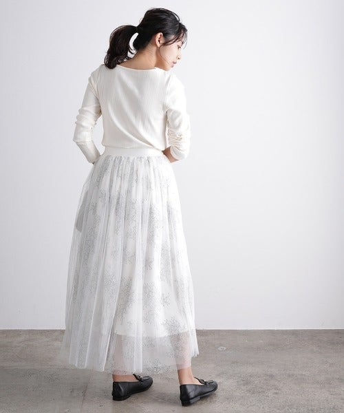 白のドット柄チュールスカートは一見ガーリーになってしまいそう。