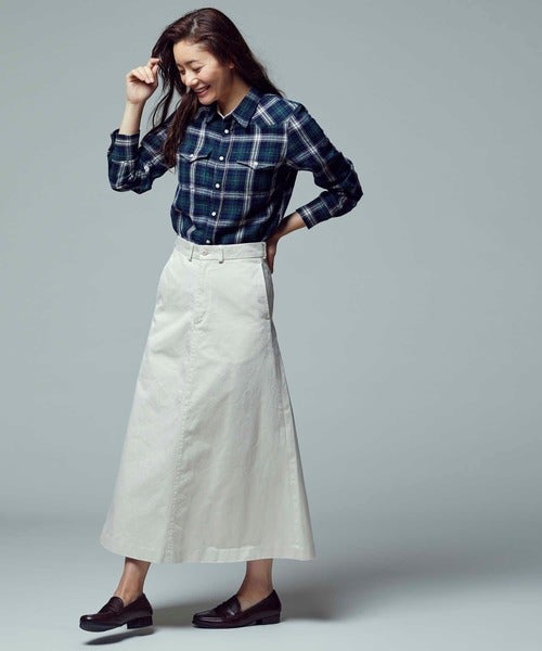 メンズライクなチェックシャツで白スカートを引き締めると、大人ならではの着こなしに。