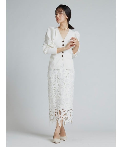 タイトなシルエットのレーススカートは上品できちんと見えるアイテムです。
