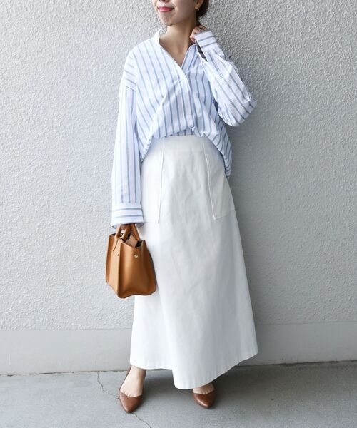 白スカートとストライプシャツの組み合わせは、とっても涼しげで春感を引き出してくれます。