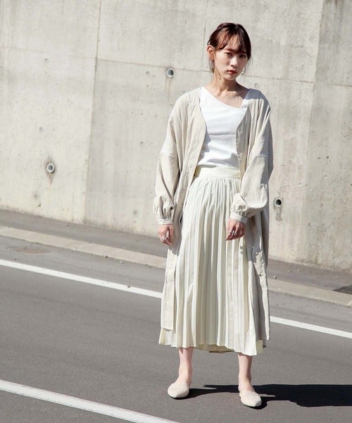 白のプリーツスカートも、ロング丈のアウターを羽織ることですっきりと着こなせます。
