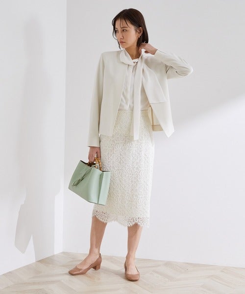 タイトなシルエットのレーススカートとノーカラージャケットの組み合わせでかっちりしたコーディネートを。