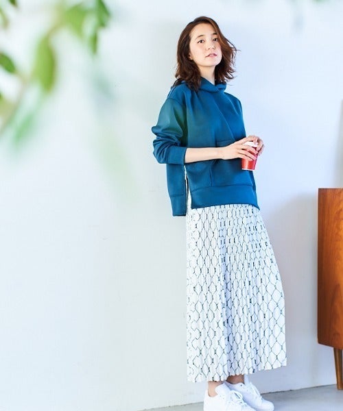 ローププリントの白スカートとブルーのパーカーで存在感が出るコーディネートに。