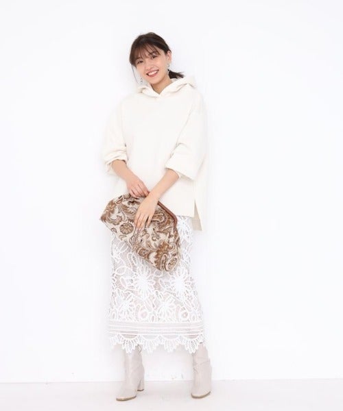 レディライクなレーススカートとカジュアルなパーカーですが、色を合わせると違うタイプのアイテムでもうまく馴染んでいます。