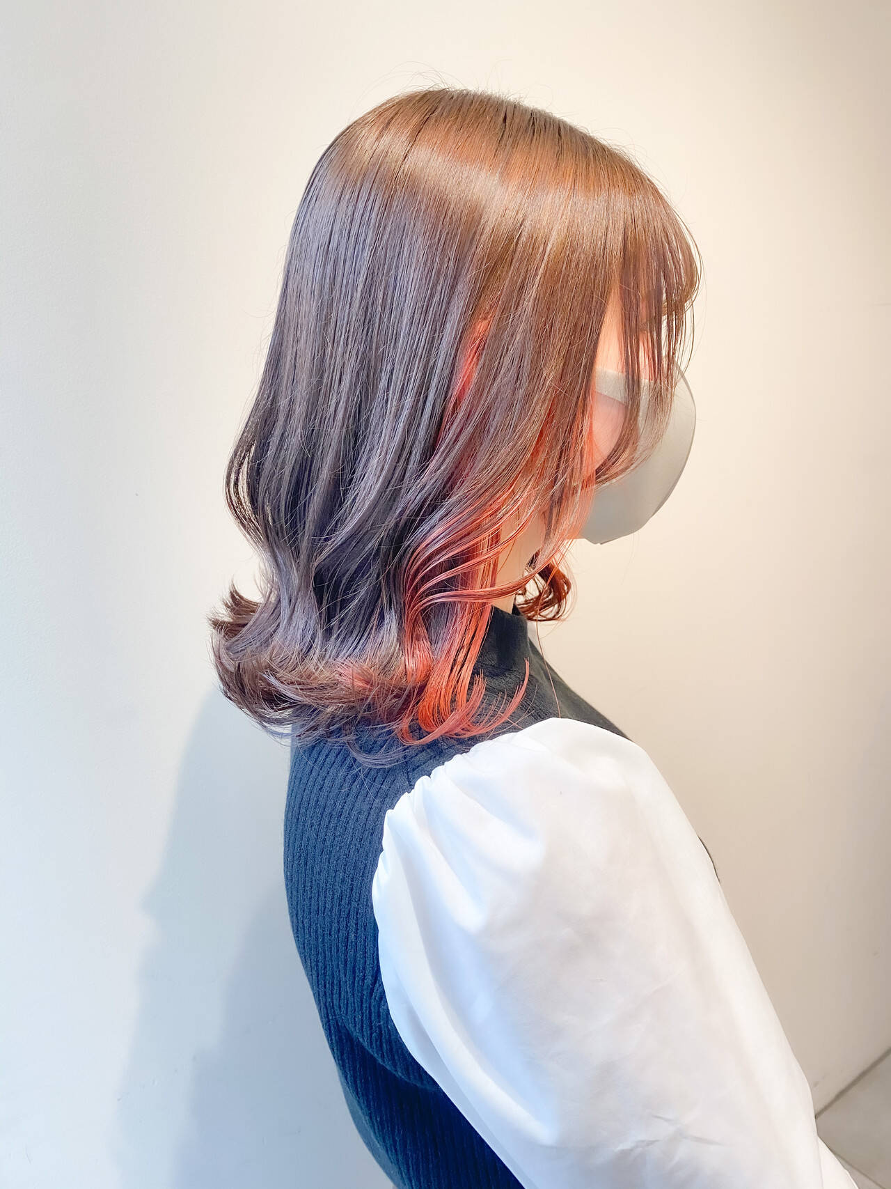 ”卒・無難”なミディアムヘアには、差し色カラーを提案。派手なだけじゃなく、かわいらしさも演出可能なオレンジカラーをインナーにプラスして。