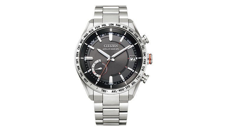 シチズンの「アテッサ」シリーズのGPS衛星電波時計。簡単な操作で現地の時刻に合わせられる「ダイレクトフライト」機能搭載。スーパーチタニウム