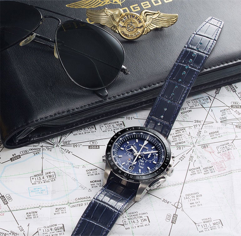 エプソンのウォッチブランド「TRUME(トゥルーム)」より発表された、GPS電波ソーラーのパイロットウォッチ。高度3万フィートからの空色をイメージして名付けられた「紺碧」「漆黒」「東雲」の3色で展開されている。
