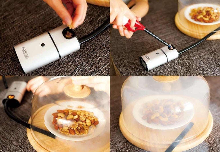 スモークインフューザーは、スモークチップの煙を先端にあるチューブから送り出す構造。使用方法はたったの3ステップだ。本体に付属のスモークチップを入れ、電源を入れてチップに着火。密閉容器(ポリ袋でも代用可能)内にスモークが充満したら電源を切って待つだけ。