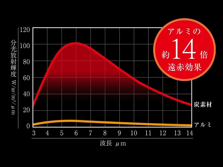 研究を重ねてでき上がった極厚の炭プレートは、優れた遠赤効果を発揮し、蓄熱性も十分。使用している炭素材は、アルミ素材の約14倍もの遠赤効果があるという。